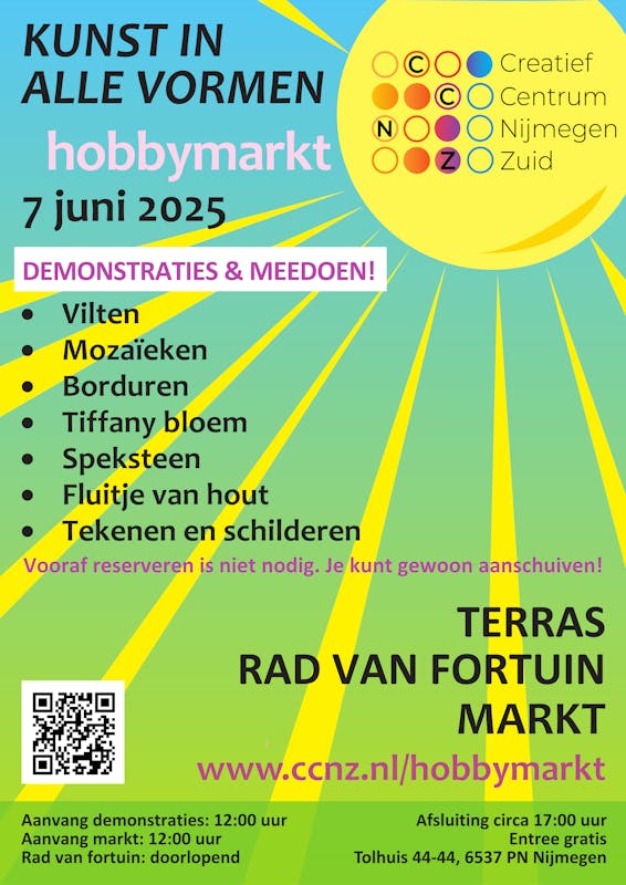 Zaterdag 7 juni vindt in het gebouw en op de parkeerplaats van het Creatief Centrum Nijmegen Zuid de hobbymarkt ‘Kunst in alle vormen’ plaats. Een markt met een creatieve inslag met tal van activiteiten waaraan je kunt deelnemen. Natuurlijk kun je ook gewoon komen kijken naar de ‘kunst’ die onze begeleiders en deelnemers hebben gemaakt. Kom naar een demonstratie en sluit aan.