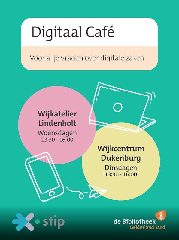 Wil je hulp bij het gebruik van je computer, tablet of telefoon? Kom dan naar het Digitaal Café. Hier kun je gratis terecht met al je vragen over digitale zaken. Er zijn ook laptops waar je op kunt oefenen.