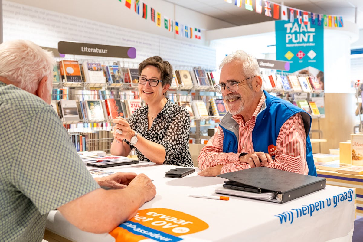 In een klein groepje legt een OV-ambassadeur onder andere stapsgewijs uit hoe een OV-chipkaart aan te vragen, hoe met een betaalpas te reizen en hoe het in- en uitchecken werkt in trein, tram en bus.