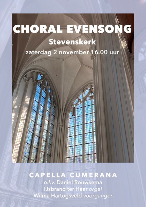 Op zaterdagmiddag 2 november zingt Capella Cumerana o.l.v. Daniel Rouwkema om 16.00 uur een bijzonder programma in de monumentale Stevenskerk. November is de maand waarin vele dagen van bijzondere gedachtenis een plek hebben: Allerheiligen (1 nov.), Allerzielen (2 nov.) en Sint Maarten (11 nov.). Capella Cumerana zingt een Evensong met muziek vol van gedachtenis aan hen die ons zijn voorgegaan.