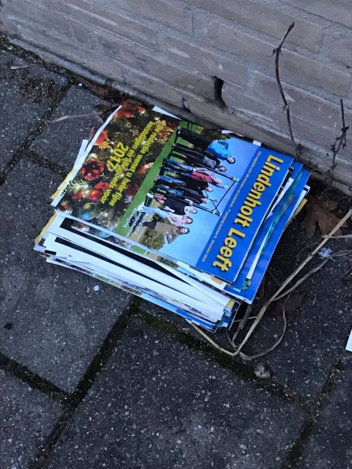 Een, terecht, bericht,- met bovengenoemde omschrijving, - isdoor een inwoner van Lindenholt verstuurd naar de Facebook Pagina van“Lindenholt leeft”. Het gaat hier om een bundel tijdschriften van “Lindenholtleeft” die niet zijn bezorgd maar zijn gedumpt in de omgeving van hetwinkelcentrum Leuvensbroek.