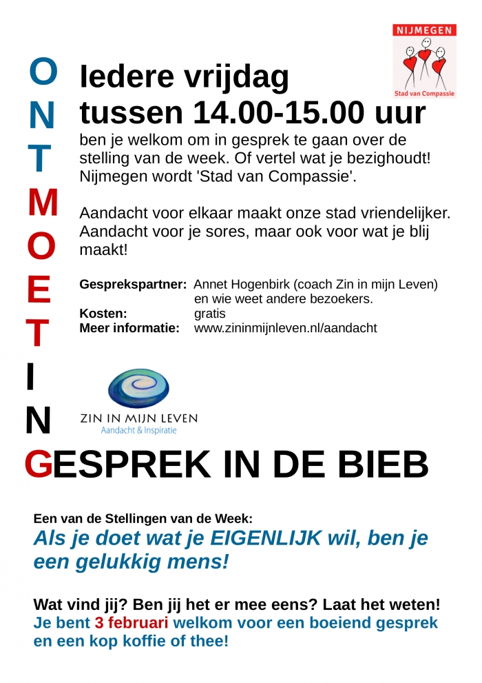 Heb jij ook genoeg van al dat negatieve nieuws? Kom dan ook eens langs tussen 14.00 en 15.00 uur in Bibliotheek Zwanenveld. Elke week kun je aanschuiven voor een kort of lang gesprek en gratis koffie of thee! Er is een stelling waarop je kunt reageren, maar je kunt ook gewoon zelf bepalen waar je het over wilt hebben. De stellingen hebben te maken met 'Compassie', een duur woord voor vriendelijkheid en warmte voor elkaar, open staan voor de ander. In de gesprekken blijkt dat veel mensen wel iets aan een ander te danken hebben. Gewoon omdat ze gestimuleerd worden door een compliment ofzo. Meer weten? Kijk op: www.zininmijnleven.nl/aandacht/ontmoeting-in-de-bieb of kom gewoon eens aanwaaien!