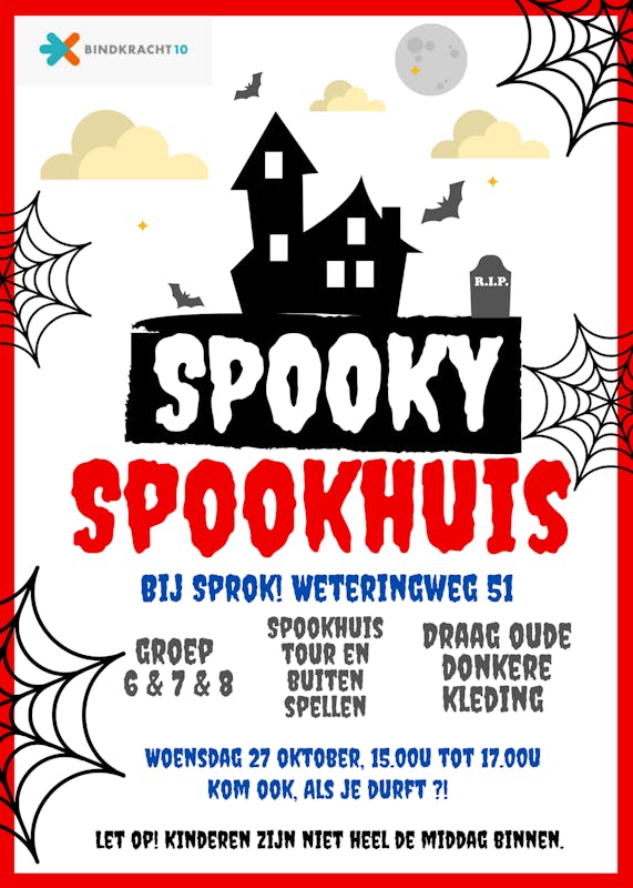 Let op het spookhuis is binnen, kinderen wachten buiten en gaan in groepjes naar binnen. Kinderen zijn dus niet van 15:00 tot 17:00u continu binnen. Buiten worden er ook activiteiten georganiseerd door de sportdocent en buurtsportcoach van gemeente Nijmegen.