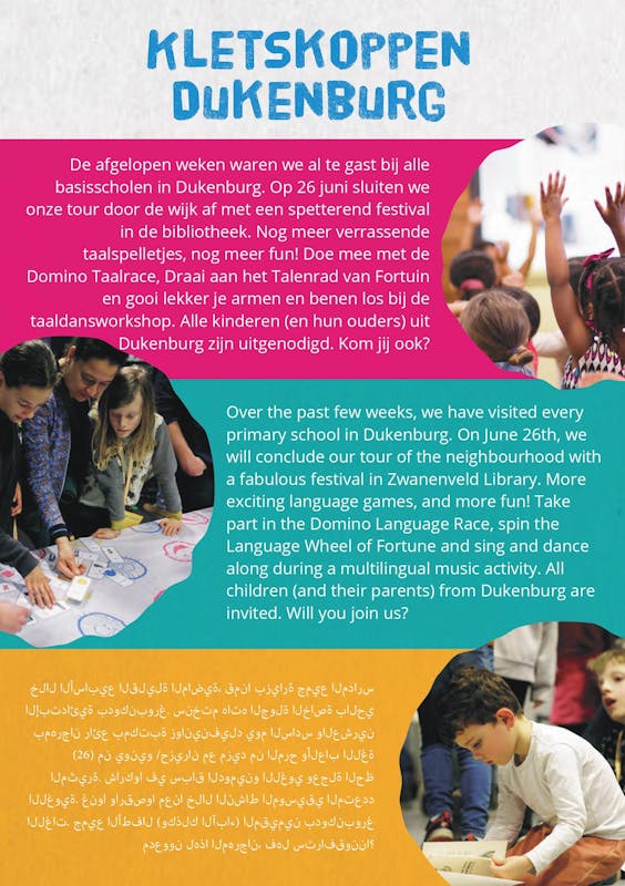 Doe mee met verrassende taalspelletjes! De Domino Taalrace, Draai aan het Talenrad van Fortuin en gooi lekker je armen en benen los bij de taaldansworkshop. Alle kinderen van 4 t/m 12 jaar (en hun ouders) zijn uitgenodigd. Kom jij ook?