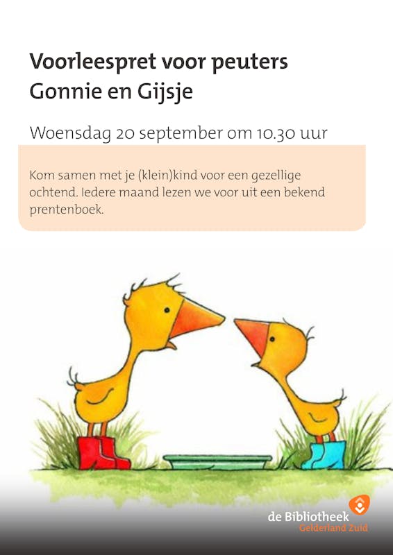 Op woensdag 20 september lezen we voor uit Gonnie en Gijsje. De serie over het kleine gansje Gonnie en haar ganzenvriendjes is heerlijk hartverwarmend. De verhaaltjes zijn voor dreumesen en peuters herkenbaar en grappig, maar zijn ook leuk om voor te lezen!