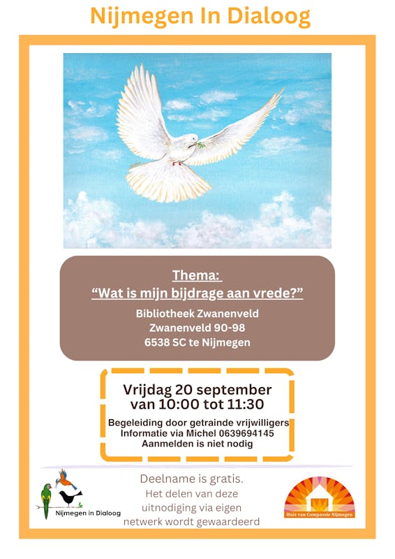 In deze vredesdialoog op vrijdag 20 september (10.00 - 11.30 uur) in Bibliotheek Zwanenveld deel je persoonlijke verhalen met mensen die je niet vanzelf tegenkomt en ontdek je andere, vaak verrassende invalshoeken.