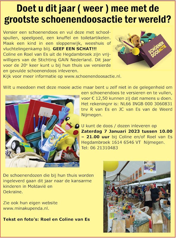 SCHOENENDOOSACTIE Doet u dit jaar mee met de grootste schoenendoosactie ter wereld? Versier een schoenendoos en vul deze met schoolspullen, speelgoed, een knuffel en toile...