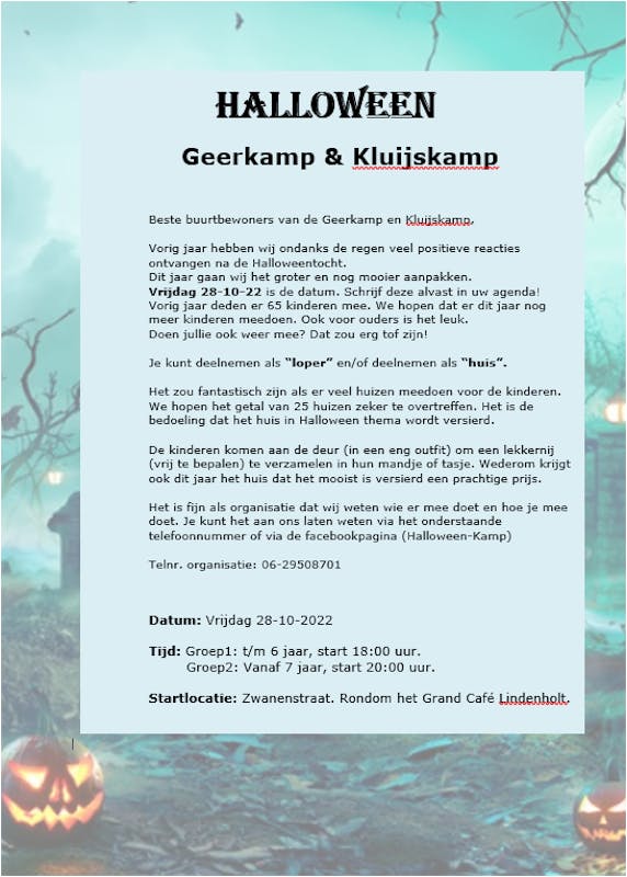 Vrijdag 27-10-2023 wordt er weer een Halloween avond gehouden voor de kinderen van de Geer en Kluijskamp. U kunt u zelf opgeven als huis en/of als loper. vorig jaar deden er ma...